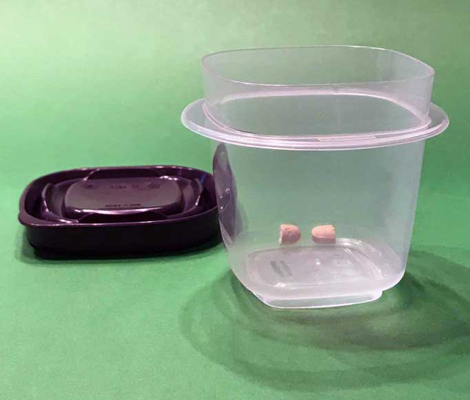 You need to use a wide mouth container when using the small oral syringe to measure the dose. The one pictured above has a lid that is harder to remove that other types of jars like the ones pictured below.  Small jelly jars are also useful.