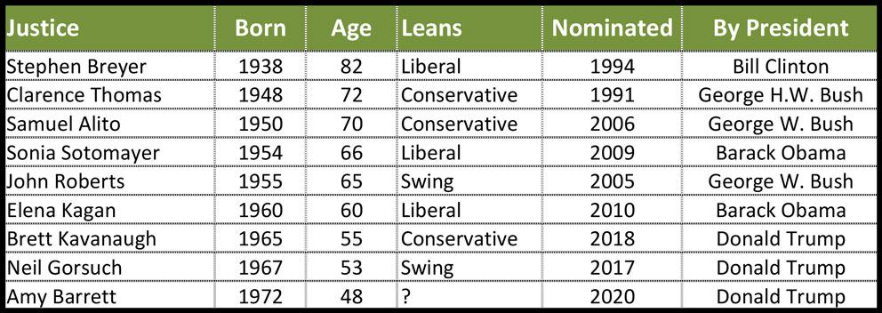 Here are the ages of the current Justices assuming Amy Barrett is confirmed.